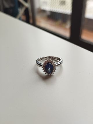 Elegante sortija de plata 925 de joyería, con sello, que muestro en fotos, con un diseño inspirado en el estilo victoriano. La pieza central esta engarzada y es un zafiro azul tafetado de laboratorio, rodeado de pequeñas circonitas, talla 17 y medio española. - Material: Plata 925. - Diseño: Estilo victoriano. - Gema principal: Zafiro azul de laboratorio - Incluye joyero.