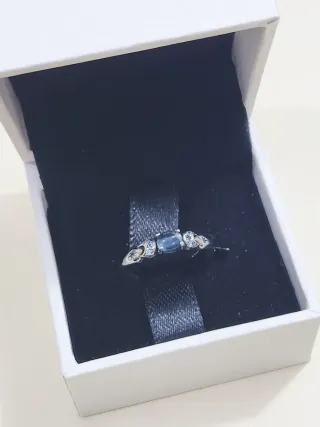 Anillo inspirado en la Princesa Jasmine de Aladdin. - Diseño con gema central azul. - Detalles laterales con pequeñas gemas transparentes. - Talla 52 (16.5 mm). Como nuevo 2 puestas Se vende en su caja original