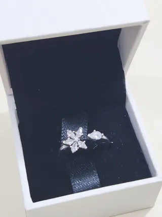 Elegante anillo con un diseño delicado y brillante. - Elaborado en plata. - Detalle de flor central con circonitas. - Adorno adicional de circonita en forma de lágrima. Como nuevo en su caja original