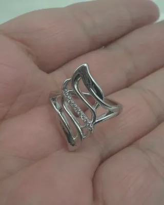 Anillo de diseño moderno y sofisticado con detalle central de circonitas cúbicas que aportan un brillo delicado y elegante. Su estructura combina líneas curvas con acabado pulido, creando una pieza llamativa y fina al mismo tiempo. ✔️ Talla 7 / 54 ✔️ Largo frontal: 2,3 cm ✔️ Estado: completamente nuevo, se entrega en óptimas condiciones ✔️ Detalle con circonitas cúbicas que aportan elegancia y diseño.