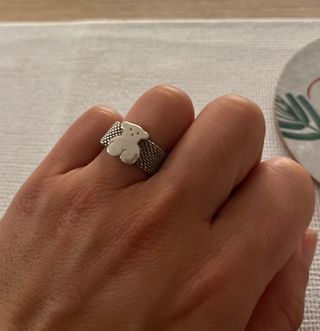 Anillo de la marca Tous con un diseño de oso. - Diseño de oso. - Banda de malla plateada.