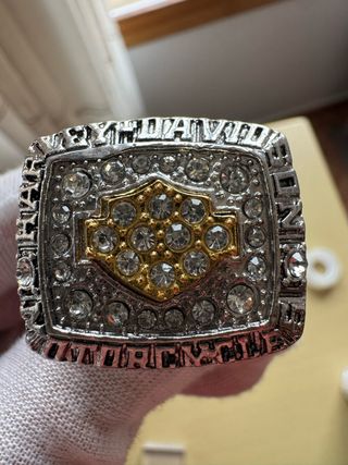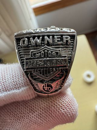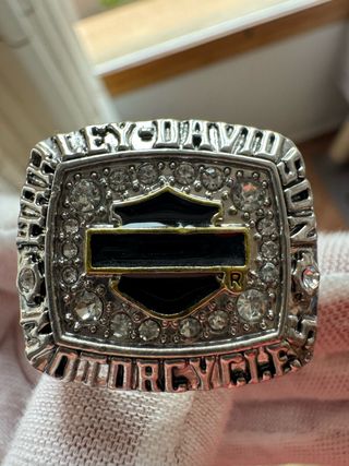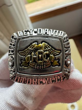 Anillo conmemorativo de Harley Davidson. - Diseño con el logo clásico de la marca. - Detalles en color dorado y plateado. - Inserciones de piedras brillantes.