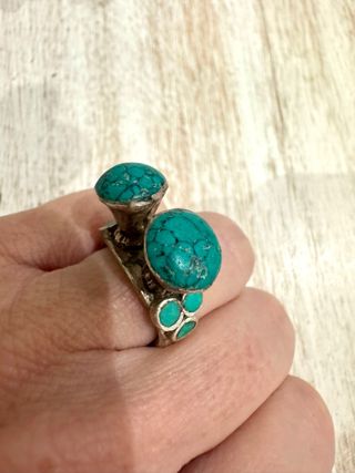 Anillo étnico vintage con piedra natural turquesa Le falta una piedra pequeña. La turquesa es una gema muy valorada, considerada históricamente un símbolo de buena fortuna, protección y paz interior en diversas culturas. - Elaborado en plata de ley. - Presenta dos piedras principales de turquesa. - Adornado con pequeñas piedras de turquesa adicionales en la banda.