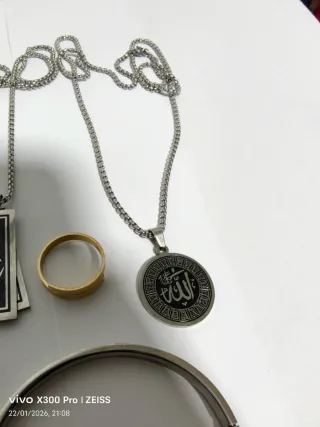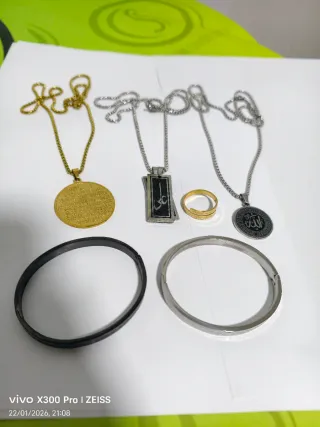 Conjunto de accesorios de joyería que incluye un anillo, dos pulseras y tres colgantes. - Un anillo de color dorado. - Una pulsera rígida de color negro. - Una pulsera rígida de color plateado con textura. - Un colgante con cadena dorada y medallón circular grabado. - Un colgante con cadena plateada y medallón rectangular negro con inscripciones. - Un colgante con cadena plateada y medallón circular con inscripciones.