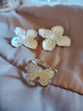 Conjunto de anillo y pendientes con diseño de mariposa. - Anillo plateado con detalles blancos. - Pendientes blancos.