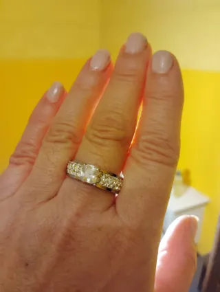 Elegante anillo con un diseño moderno y detalles brillantes. - Fabricado en acero y oro. - Adornado con circonitas.