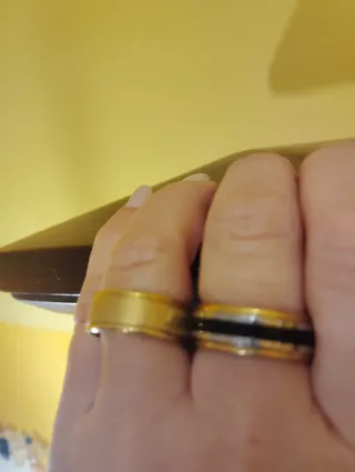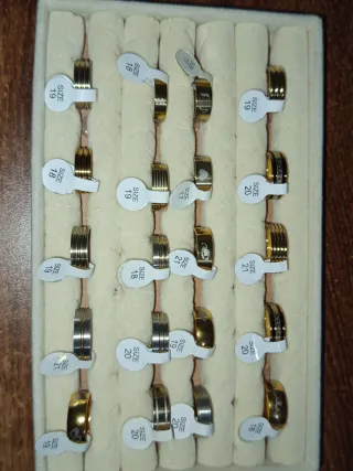 .Anillos de acero inoxidable en diferentes tallas. Diseños modernos y elegantes. Cada uno 7e y si te llevas dos 12 - Material: Acero inoxidable. - Acabado: Negro y dorado. - Tallas disponibles: 20, 22 y otras. - Diseño con textura.