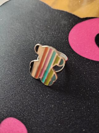 Este anillo tiene un diseño de oso con rayas de colores. Es playa de ley 925 milésimas. Peso 8 gramos - Diseño de oso. - Rayas multicolor.
