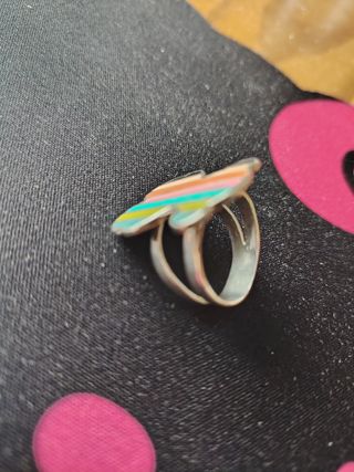 Anillo de señora con un diseño ovalado y detalles coloridos. - Banda metálica plateada. - Gema central con patrones en rojo, blanco y verde.
