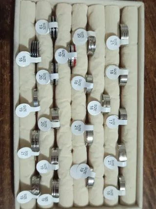 Conjunto de 20 anillos de acero inoxidable en diferentes tamaños. Lote de anillos de acero inoxidable Talla desde 17 hasta el 21 Escríbeme si te interesa por unidad para mostrar los modelos y tallas Por lote no se puede elegir vienen varias tamaños y diseños Unidad 2€ Lote 20 anillos 10€