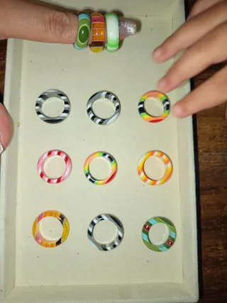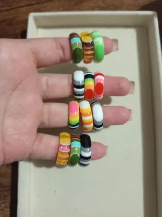 Conjunto de anillos de resina con diseños vibrantes. Lote de 6 anillos - Material: resina - Diseño: Rayas y patrones circulares - Acabado: Brillante
