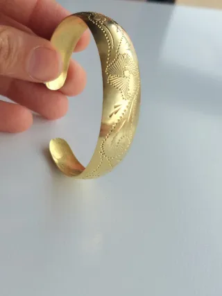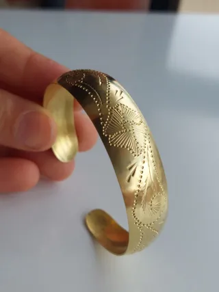 Elegante pulsera abierta de latón con un diseño grabado (mantiene ese color para siempre, se renueva al lavarla) - Material: Latón (cobre amarillo). - Diseño: Grabado floral y de hojas. Se ha hecho la comprobación para que se vea que es de cobre (color verde con el acido, ver fotos) Se ve igual que el ORO...hay una foto con un Anillo de ORO para que se vea EL COLOR (solo para mostrar el collor,el anillo no incluido) Pesa poco