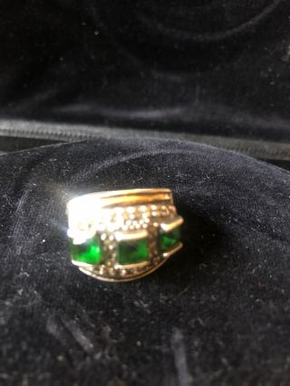 Elegante anillo con detalles en oro y piedras verdes. - Diseño con incrustaciones de piedras cuadradas. - Combinación de plata y oro. Es talla 8 y es un buen anillo de plata de 925 y una lámina de 18kl