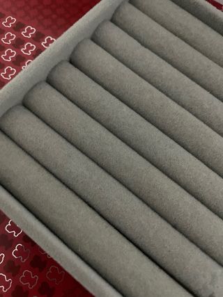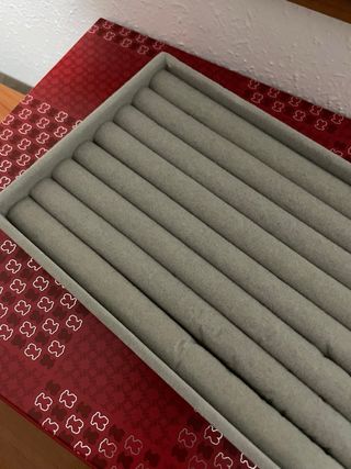 Bandeja ordenación joyas en terciopelo gris, tanto para anillos como para pendientes.