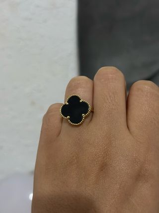 Elegante anillo con diseño de trébol. - Detalle central en color negro. - Aro y borde en tono dorado.