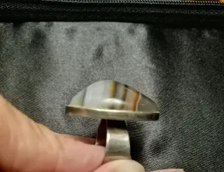Anillo con una piedra de ágata natural y montura de plata. Comprado en Cristalina en Brasil antigüedad unos 60 años. - Diseño único con bandas de ágata en tonos marrones y blancos. - Montura de plata de ley pulida.