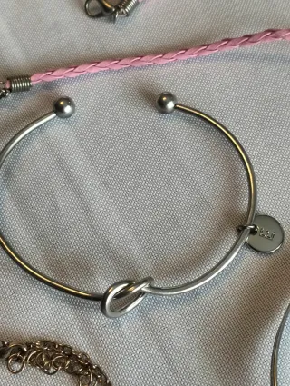 Conjunto de bisutería que incluye varias pulseras y un anillo. - Pulsera plateada con nudo. - Pulsera con cadena y adornos dorados. - Dos pulseras rígidas plateadas. - Pulsera de cordón trenzado rosa. - Anillo plateado con detalles.