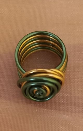 Anillo hecho a mano con alambres policromados en forma de flor. - Diseño único y llamativo. - Combina tonos dorados y verdes. - Talla 16 o S. - Realizado por artesana local. - Sin estrenar