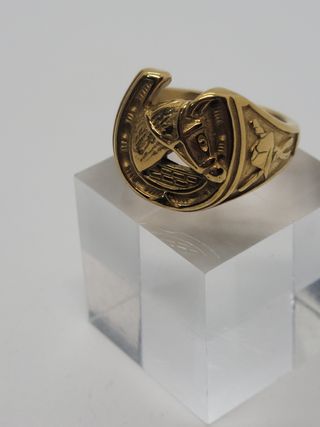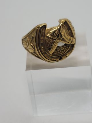 Anillo con diseño de herradura y cabeza de caballo. - Diseño detallado de herradura. - Representación de cabeza de caballo. - Acero quirúrgico chapado en oro.