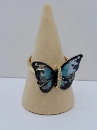 Anillo con un diseño de mariposa muy detallado. La banda del anillo es dorada y está adornada con pequeñas circonitas que le dan un toque brillante. - Diseño de mariposa. - Banda dorada. - Adorno de circonitas. - Ajustable