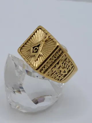 Anillo de estilo masónico con detalles grabados. - Diseño con el símbolo de la escuadra y el compás. - Inscripción MASON en el lateral. - Detalle de corazón con flecha en el otro lateral. - Acero quirúrgico chapado en oro