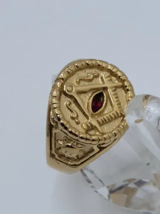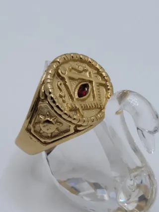 Anillo de estilo masónico con un diseño distintivo y una piedra central. - Diseño circular con símbolos masónicos. - Detalle de piedra de color rojo. - Acero quirúrgico chapado en oro.