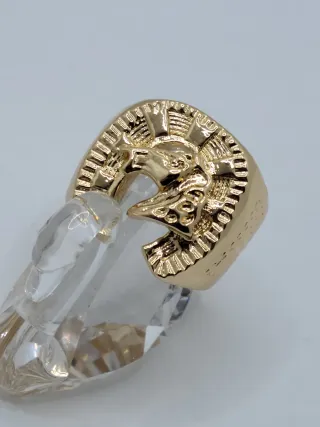 Elegante anillo con un diseño de querubín en relieve. - Acero quirúrgico chapado en oro. - Consulta tallas disponibles. - Diseño clásico y detallado.