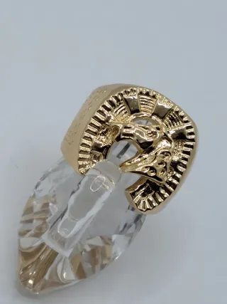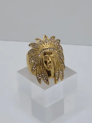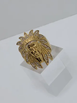 Precioso anillo con diseño de jefe indio. Material: Acero quirúrgico de alta calidad. Acabado: Chapado en oro. Detalles: Adornado con circonitas brillantes. Tallas: Consultar disponibilidad de tallas. ¡Ideal para añadir un toque único a tu estilo!