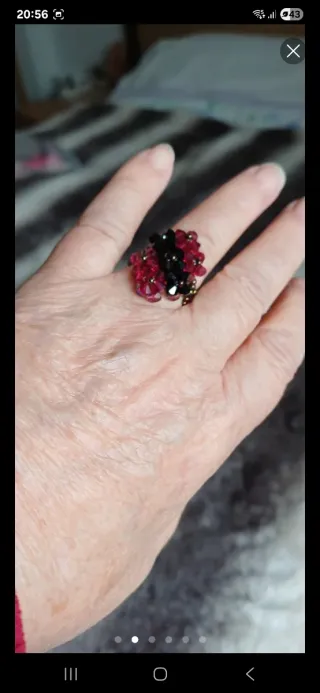 Anillo de bisutería con un diseño llamativo. -Hecho a mano - Adornado con cuentas rojas y negras. - Montura dorada.