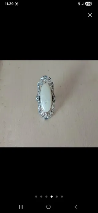 Elegante anillo con un diseño vintage y una piedra central ovalada. - Montura de plata con detalles ornamentales. - Piedra central de color blanco cremoso. #sortija #anillo #plateado #ajustable #piedraspreciosas