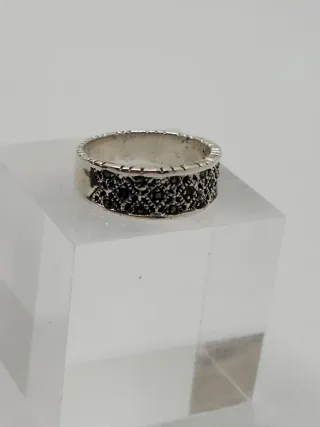 Elegante y llamativo anillo de plata de primera ley (plata 925) con incrustaciones de circonitas negras que le dan un toque distintivo. El diseño es moderno y versátil, perfecto tanto para el día a día como para ocasiones especiales. Material: Plata de primera ley (925) Piedras: Circonitas negras