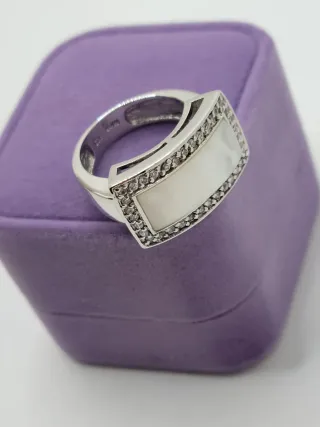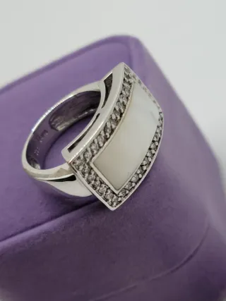 ¡Gran oportunidad! Se vende precioso y elegante anillo de plata de primera ley 925 con incrustaciones de nácar y circonitas. Es un anillo robusto con un brillo tornasolado del nácar que lo hace único y llamativo. Ideal para cualquier ocasión o como un regalo especial. Características Principales: Material: Plata de primera ley (925) Piedras: Nácar natural y circonitas Diseño: Elegante, con forma rectangular