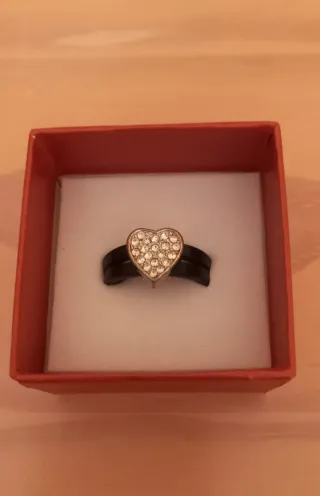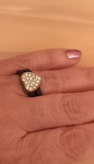 Anillo con diseño de corazón adornado con piedras brillantes y banda de acero. - Diseño de corazón con múltiples piedras. - Banda de acero y aro de cuero - Estilo moderno y elegante. - Poco uso. Tamaño pequeño 16 o S.