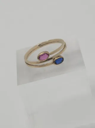 Precioso anillo de diseño abierto y ajustable, ideal para lucir en cualquier ocasión. El material gold-filled es de alta calidad y duradero, manteniendo su brillo como el oro macizo. Material: Gold-filled (oro laminado), un material hipoalergénico que mantiene su brillo dorado con el tiempo. Color: Dorado. Piedras: Dos piedras de colores, una rosa y otra azul Ideal para: Regalo especial, uso diario o para combinar con otras joyas. ¡Gran oportunidad!