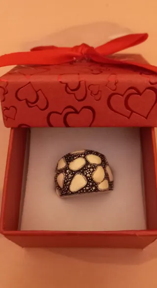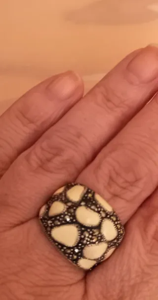 Anillo con diseño inspirado en piel de serpiente. - Elaborado en plata de 925 m - Piedras blancas de piel se serpiente y circonitas. - Joyería local. Talla 16 o S. Pequeña. - Usado en una ocasión