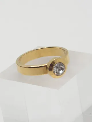 Anillo de acero quirúrgico con un elegante chapado en oro. Su diseño es moderno y llamativo. - Acero quirúrgico de alta calidad. - Acabado dorado brillante. - Diseño con detalles grabados. - Piedra central de cristal.