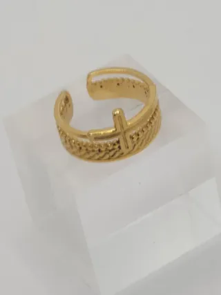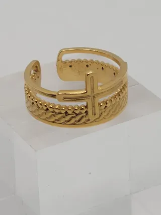 Anillo ajustable con diseño de cruz. - Fabricado en acero quirúrgico. - Acabado chapado en oro.