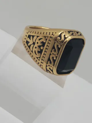 Elegante anillo con un diseño clásico y detalles ornamentales. - Material: Acero quirúrgico. - Acabado: Chapado en oro. - Piedra central: Ónice. - Diseño: Ornamentado.