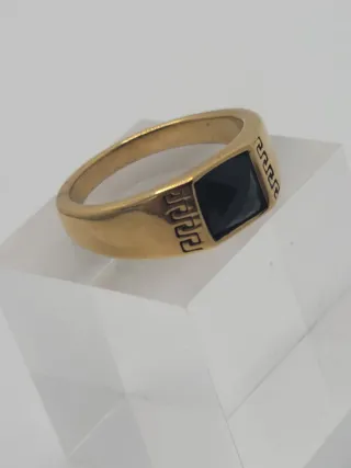 Elegante anillo con un diseño clásico y moderno. - Fabricado en acero quirúrgico. - Acabado chapado en oro. - Cuenta con una piedra de ônice. - Diseño con greca griega.