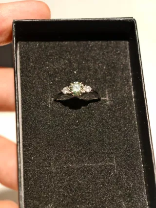 Elegante anillo con una moissanita verde central y dos pequeñas circonitas a los lados. - Diseño delicado y moderno. - Montura en plata. S925