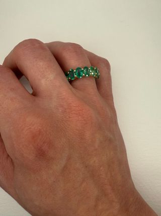 Anillo de eternidad en oro amarillo de 14 quilates con 17 esmeraldas ovaladas de corte mixto, con un peso total de 7.28 quilates y certificado por IGl.