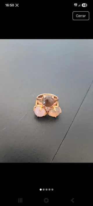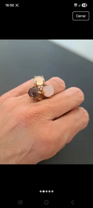 Anillo con tres piedras de colores, una marrón y dos rosadas. - Diseño con tres gemas. - Montura dorada.