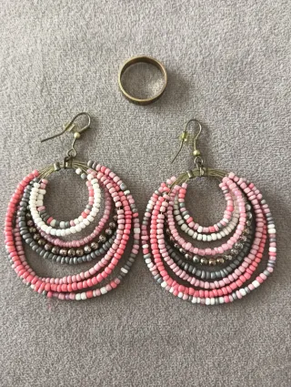 Conjunto de pendientes y anillo. No pesan - Pendientes circulares con cuentas rosas, coral, blancas y grises. - Anillo liso de color dorado.