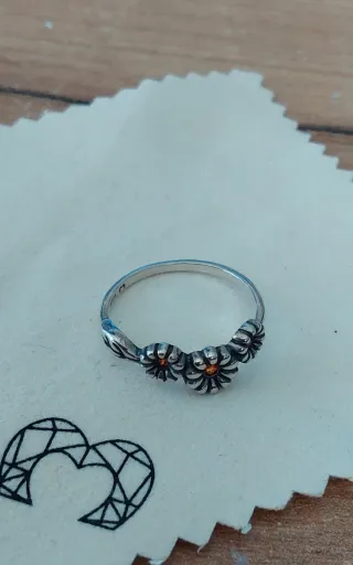 Anillo delicado con un diseño de tres margaritas. NO ES NEGOCIABLE, ESTA MUY REBAJADO Talla 13 Nuevo, sin uso Plata de primera ley y tres circonitas Marca joyeria Francesa Le Petite Marie - Detalles en color naranja. - Acabado plateado.