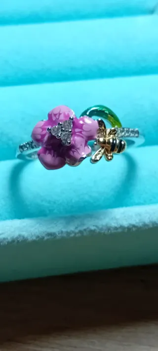 Precioso anillo con diseño de flor y abeja. Talla 21 - Elaborado en plata de ley. - Detalle de esmalte en la flor. - Pequeños detalles de circonitas en la flor.