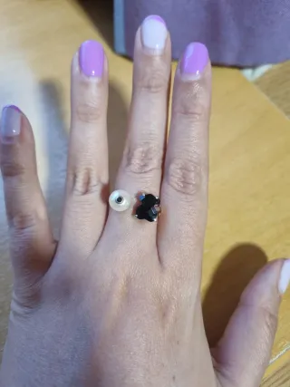 Elegante anillo plateado con un diseño único. - Dos perlas adornan este anillo. - Talla ajustable para mayor comodidad. -Bisuteria