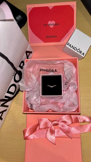 Elegante anillo Pandora. - Diseño delicado en forma de V de un hueso de la suerte, combina superficies lisas y brillantes. - Acabado en oro 14k. - Decorado con 25 circonitas cúbicas talla brillante. - Nuevo sin uso, con cajita pequeña, caja de regalo y notita para dedicatoria y bolsa pandora. Precio negociable.