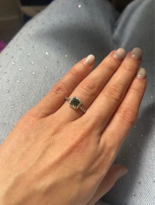 Elegante anillo de plata con circonitas y una piedra central de color verde. - Diseño con circonitas alrededor de la piedra principal. - Montura de plata. - Piedra central de corte cuadrado. Anillo de plata de con circonitas y piedra cuadrada central, rodeada de circonitas y aro con circonitas, talla 15 de palo Tatum