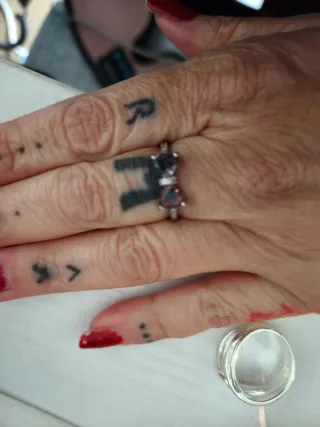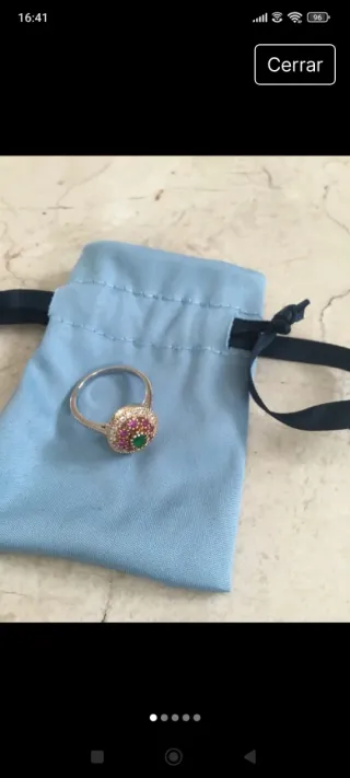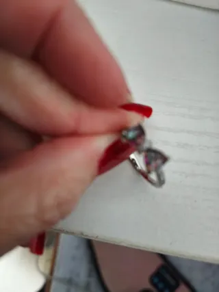 Anillo de diseño único, adquirido en una tienda local. - Montura plateada. - Detalle central con piedras verdes y rojas.