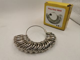 Medidor de talla de anillos tipo Ring Sizer Stick, metálico y completo. Incluye juego de aros numerados unidos por cable de acero con cierre roscado. Ideal para medir tallas de anillos de forma rápida y precisa. Perfecto para joyería, artesanos, compra online de anillos o uso personal. Se entrega con su caja original, tal como se ve en las fotos. Buen estado. 📦 Opción de envío disponible.